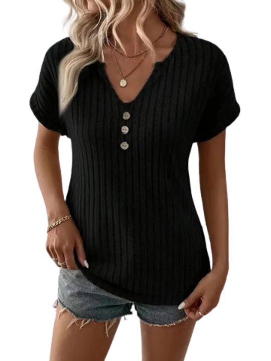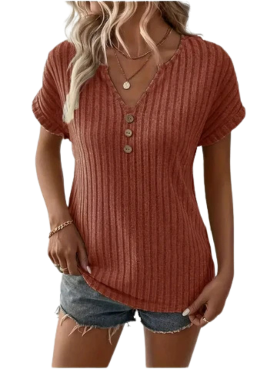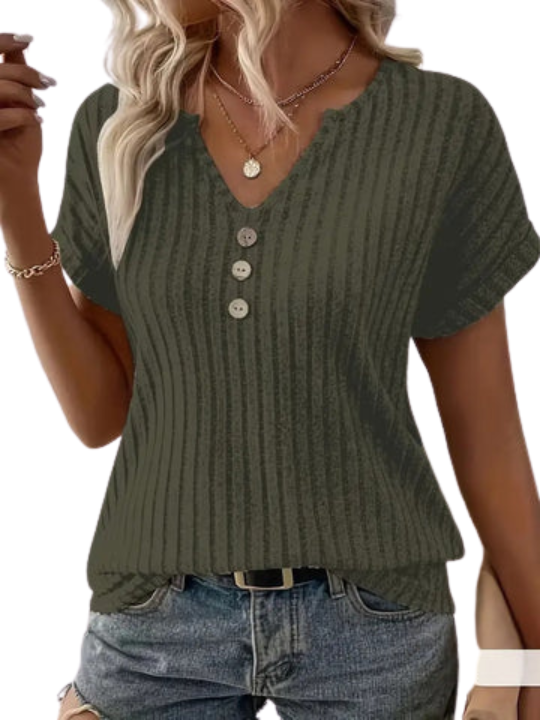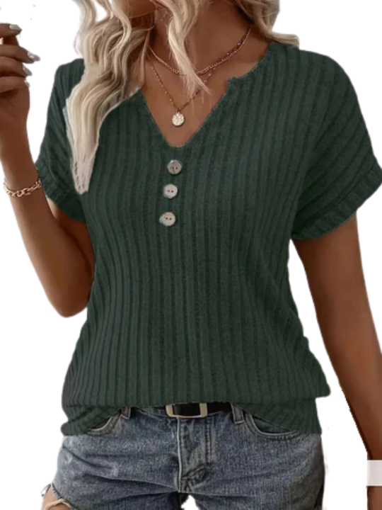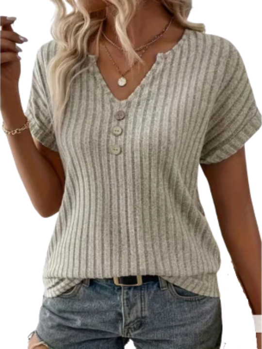 Ten luźny T-shirt charakteryzuje się eleganckim wzorem w paski, krótkimi rękawami i guzikami przy dekolcie. Dzianinowy materiał i dekolt w serek sprawiają, że jest idealny na ciepłe letnie dni.